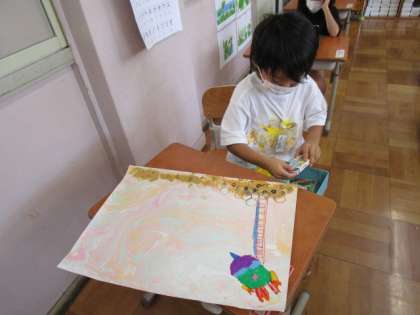 今日はまず、未来の遠足で月に到着した宇宙船を描きました。色や形、向きなどを工夫して描きました。