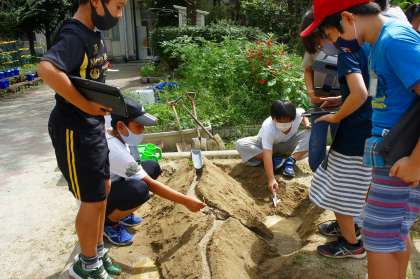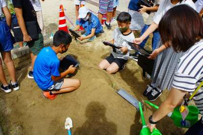 予想を立てて、運動場の砂場でいざ実験。実験中の様子は、タブレットで動画として記録します。