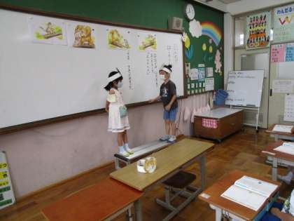 お面をかぶり、役割演技をしながら、おおかみの気持ちを考えました。これからの生活の中でも、友だちに親切にしていきたいですね。