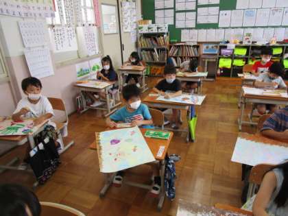今日は、思い浮かんだ場面をコンテで描き、クレパスで色を塗っていきました。自分の絵と心の中でお話ししながら、とても丁寧に描いていました。