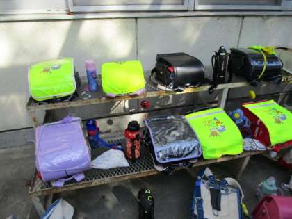 荷物置場や遊び方を学級で確かめました。放課後、運動場をのぞくと...。荷物置場にとてもきれいにランドセルを並べて、みんなでルールを守って楽しく遊んでいました。