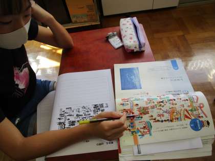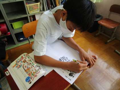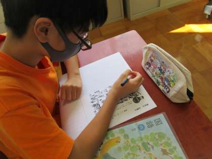 国語科「漢字の広場2」では、遊園地の絵に示されたいくつかの漢字を使って、文づくりに挑戦しました。主語と述語にできるだけたくさんの修飾語を加えることを意識して、文を作ることができました。