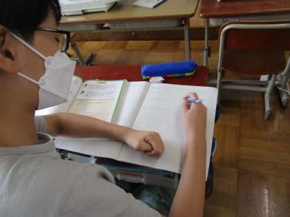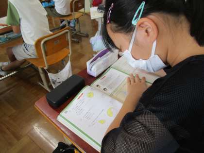算数科「円の面積」では、単元のふり返りの問題に挑戦。今までのノートや教科書を見返しながら、問題に答えていきました。
