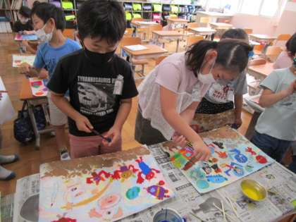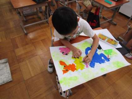 細かいところまでしっかり色を塗りこんだり、周りの様子を描いたりして、絵が完成しました。同じお話から、一人一人が想像し、絵にするとこんなにもいろいろ違うことに子どもたちは驚き、また友だちの作品の良さにも触れることができました。