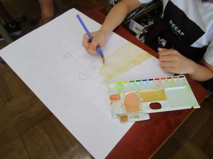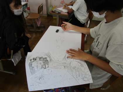 図画工作科「言葉から想像を広げて」では、お話を聞いて想像したことを絵に表しています。下絵もだいぶ進み、色をつけ始める子も出てきました。