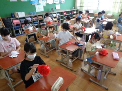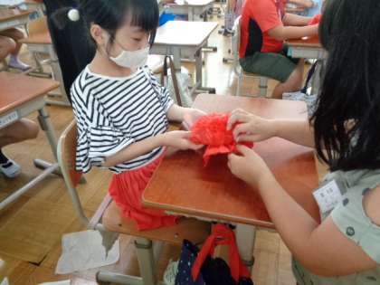 まず,お花紙できれいなお花を作りました。破れないよう,