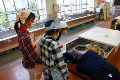 自分たちでもご飯が炊けましたね!給食のおかずと一緒にいただきました。