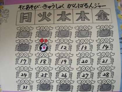 外遊びをすると、カニさんの目に色を塗ります。一日のうち、2回外遊びができると、両目に塗ることができます。また、時間内に給食を食べることができると、カニさんのおなかにシールを貼ることができます。