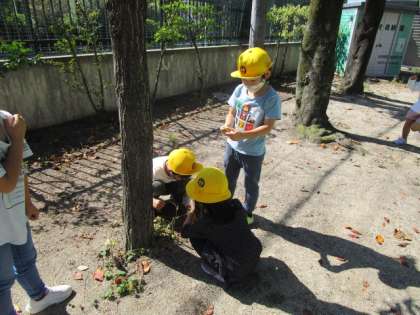 運動場に出ると、キンモクセイの香りを嗅いだり、木の葉の色が変わっていることを見つけたりしてそれぞれに秋を見つけることができました。