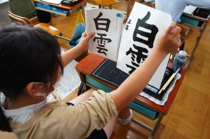 「白雲」という文字を書くことを通して、漢字同士の文字の適切な大きさについて考えました。
