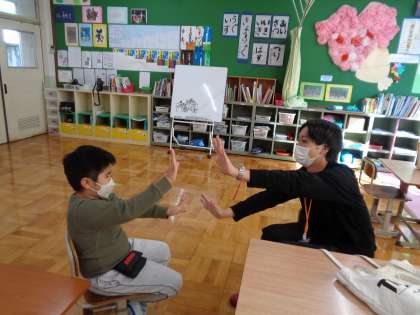 パワーアップタイムには、エアー手合せをしました。「1・2・3」で先生が出した手と同じところに手を合わせるように出しました。初めは、片手でしていましたが、だんだん早くしたり、両手でしたりして楽しみました。