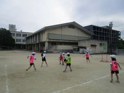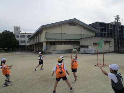 体育の学習でパスゲームに取り組んでいます。