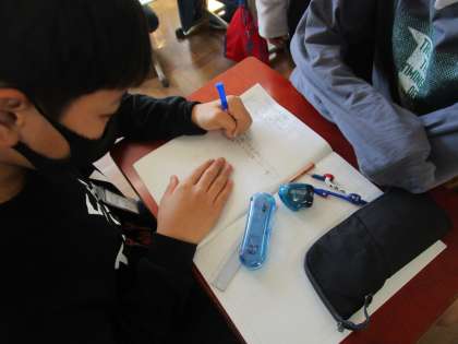 算数科「図形の拡大と縮小」では、単元の内容をふり返る練習問題にチャレンジしました。拡大図と縮図の性質を上手く使って、長さを導き出すことができました。