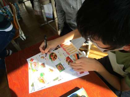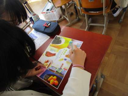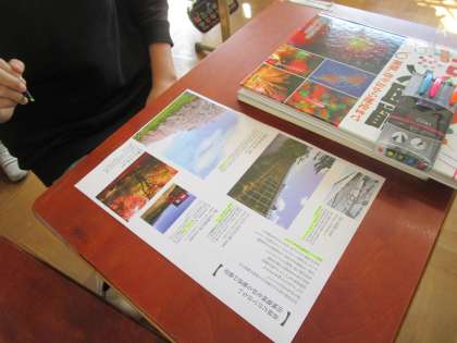 国語科「知らせよう!広めよう!私たちの地域の魅力」では、京都府内の各地のパンフレットから評価に関する表現を見つけていきました。「誰もが息を呑む」「1時間半ほどで完売する人気商品です」といった表現を見逃さずにチェックしていきました。