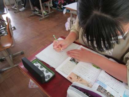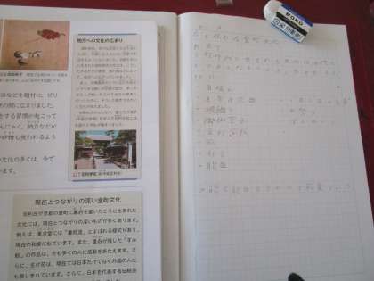 社会科「今に伝わる室町文化」では、茶の湯や生け花、水墨画以外の室町文化について調べていきました。1日3回の食事が始まったり、お祭りや盆踊りが盛んに行われていたりと、調べた事実に驚く子どもたちでした。