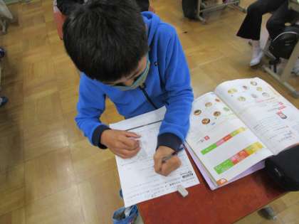家庭科「まかせてね 今日の食事」では、栄養バランスのとれた献立を作る練習をしました。教科書に載っているメニューから主菜や副菜をチョイスした子どもたち。その後、それぞれに使われている食材を6つの食品群に分け、栄養バランスを確かめていきました。
