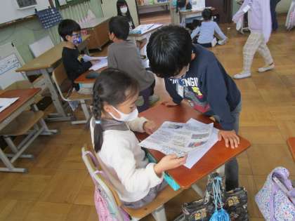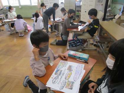 生活科で町たんけんに行って見てきたことを一人ずつ新聞やクイズにしてまとめました。今日は友達に発表して行かなかったところの様子をお互いに知らせました。梅小路の町の素敵なところが分かりました。