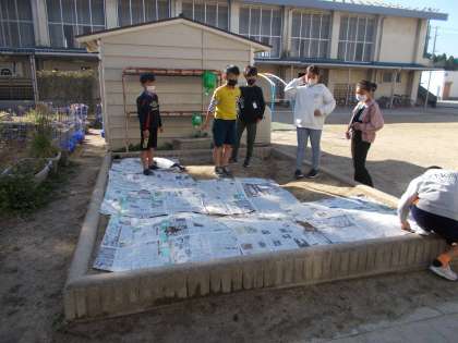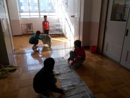 新聞紙で作った1平方メートルのシートを使って、学校の中のいくつかの場所の面積を調べました。「図書館やランチルームは、教室よりも大きいんだな。」「砂場は、12平方メートルだから12枚で敷き詰めたいな。」など楽しみながら調べていました。