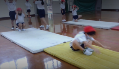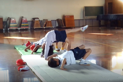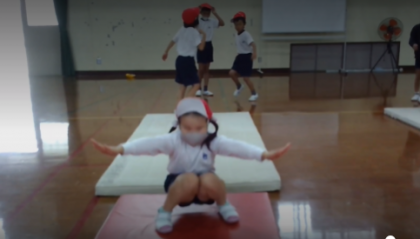 2年生になり体育科でマットあそびをしました。体慣らしの体操(ネコちゃん体操)をしています。ブリッジをした後に片足をピンと伸ばすのもお手の物です。前回りをスムーズに回るコツを見つけていきたいです。