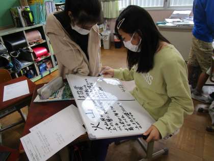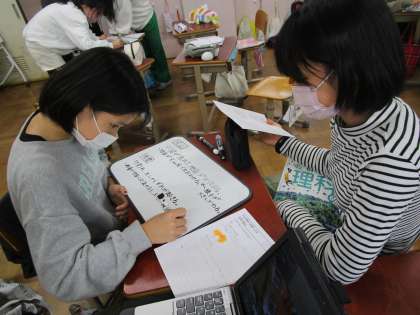 理科「土地のつくりと変化」では、地震や火山活動によって土地がどのように変化するのか、調べた結果を交流しました。グループで意見を出し合う中で、新しい考えを学ぶことができたようです。