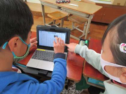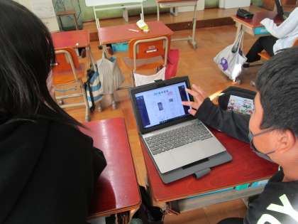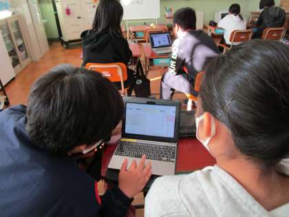 国語科「知らせよう!広めよう!私たちの地域の魅力」では、パンフレットをペアで見合いながら、修正していきました。内容はどうか、割り付けはこれでいいかなど、チェックする視点を意識しながら交流していきました。