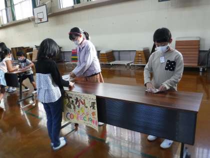 写真は、ついに1組・2組合同で買い物のやり取りをしている様子です。難しい表現も多くありましたが、子どもたちが笑顔でやり取りする姿が見られました。