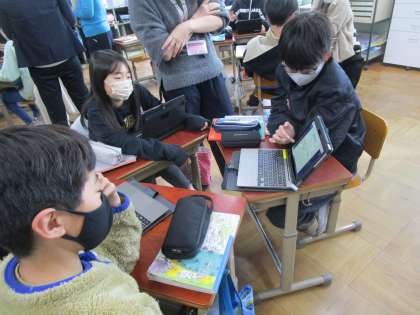 国語科「今、伝えたい!これからの私」では、スピーチにどんな資料がいるのかをタブレットを見せながら話し合いました。「もっとこんな資料にしてみたら?」「どうして紹介文を書くの?」とアドバイスを送ったり、意図を聞き合ったりしました。