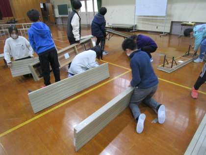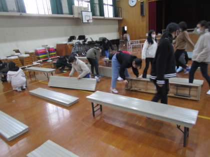 2月1日(水)の6校時に、前々日準備を行いました。長いすを出して、立てていき、鑑賞する人たちの座席を作り上げていました。ありがとう、6年生!
