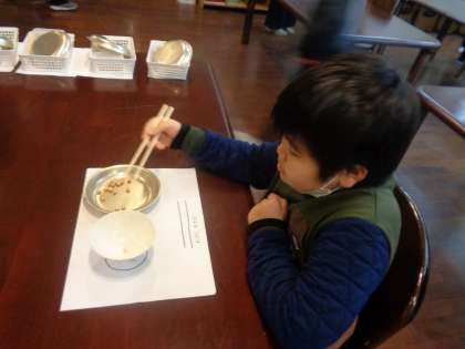 そして本番,お皿に入っていた豆を,1分間ですべて茶碗に移し替えることができました。思わず「やったー。」と声を出してガッツポーズをしていました。とても上手にお箸を使えるようになったので,給食もお箸で食べられるようになりました。