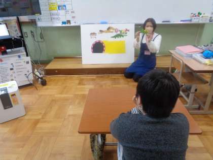 今日は,学校司書教諭の一島先生にブックトークをしてもらいました。パネルシアターで「へんしんトンネル」のお話をしてもらいました。登場人物が動いてトンネルを通ると変身するのが面白かったです。絵本でも読んだことがあるお話でしたが,パネルシアターだと,「トンネルを通ると何に変身するのかな?」と興味をひかれるようでした。