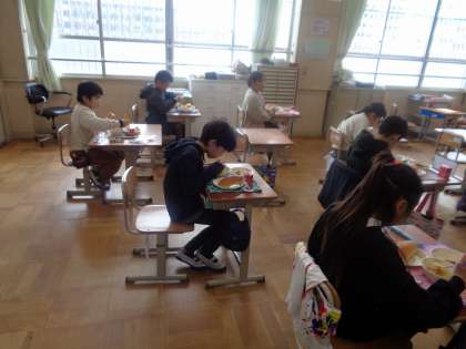 4年1組と交流給食をしました。みんなで「いただきます。」をしたあと,給食を静かに落ち着いて食べました。4年生になって,初めての交流給食でしたが,戸惑うことなくスムーズに交流できました。いつもは,少ない人数で給食を食べていますが,今日は,たくさんの友達と一緒に食べることができてよかったです。