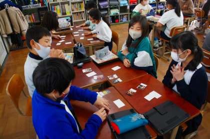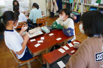 職業や肩書の言い方に慣れるために、カードを使ってゲームを行いました。何度もカードをめくっては、He is 〜・・・ She is 〜・・・ と発音していました。