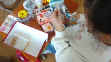 「小さな友だち」の気持ちになって、表したい部屋や飾りを考えられるように「小さな友だち」を置いたり動かしたりして確かめながら作りました。