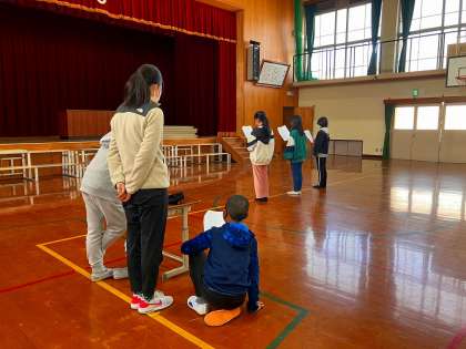 放課後、明日の「6年生を送る会」に向けて、交流委員会の5年生が体育館でリハーサルを行っていました。