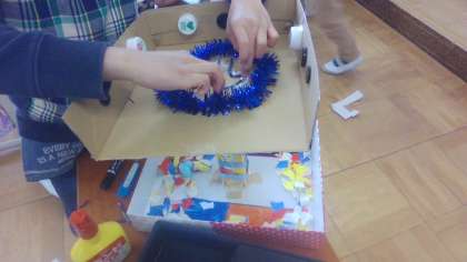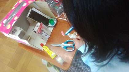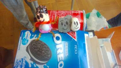箱を並べたり積んだりしながら、表したい家をイメージし、家具や遊具も作りました。