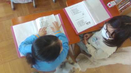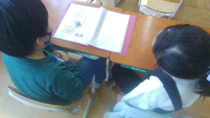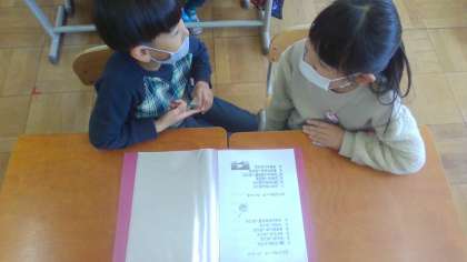 算数の授業で作ったサイコロを振り、出た目の数のテーマについてペアで話し合いました。