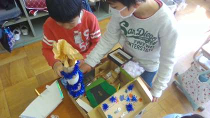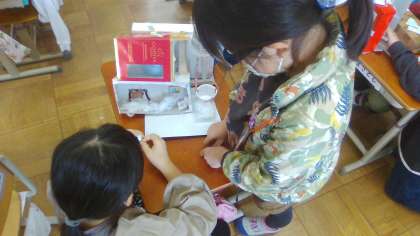 「ともだちハウス」が遂に完成し、小さな友だちを連れて、クラスの友だちのハウスへ遊びに行きました。