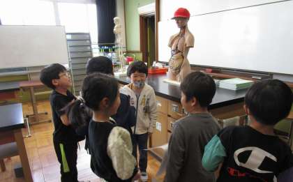 生活科「なかよしいっぱいだいさくせん」の学習で、2年生と一緒に学校探検をしました。案内役の2年生が教室にお迎えに来てくれると、1年生は嬉しそうに教室を飛び出していきました。案内されて向かった先では、各教室の説明をしてくれる2年生がお出迎え。今まで気になっていたことや不思議だったことをたくさん教えてもらいました。