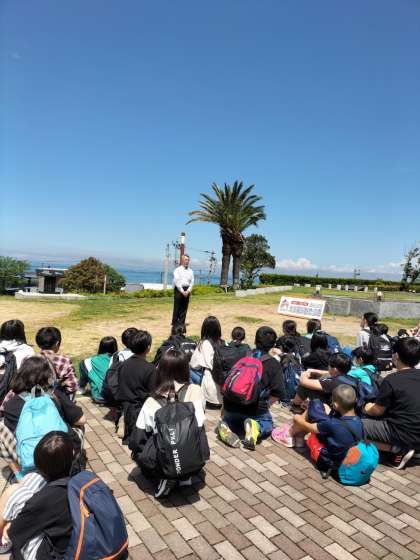 海沿いの道を通って北淡震災記念公園に来ました。館長さんの熱のこもったお話にみんな聞き入りました。「自分の命は自分で守る 家族の命も守る気持ちで」大切に心に剞み、折り鶴をお渡ししました。