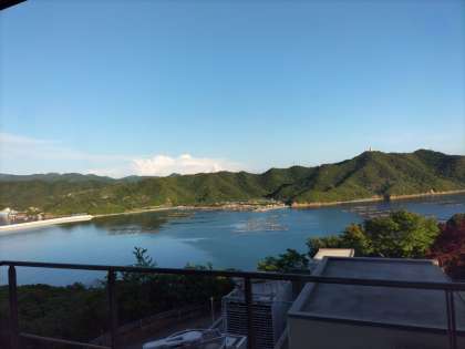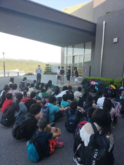 南あわじ休暇村に到着し、入館式です。お世話になるスタッフの方たちにご挨拶や梅小路小学校の紹介をしました。海の見えるとても景色のよい所です。