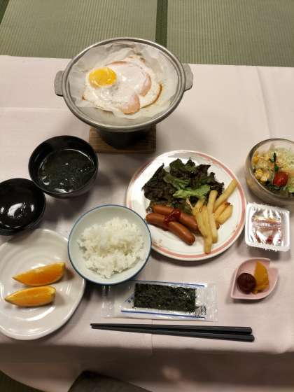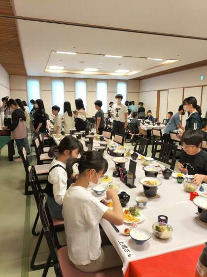 朝食タイムです。ご飯やお茶を自分で入れます。おかわり続出でした。