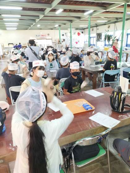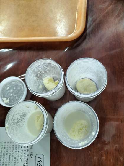 次はバター作りにチャレンジです。牛乳と生クリームの入った容器を上下に強く振ります。音を確かめながら懸命に振ると、バターとミルクに分離成功!クラッカーにつけておいしくいただきました。