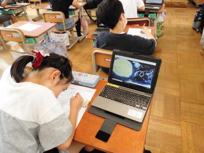 「身近な自然の形・色」の学習では本物の植物の葉を張り付けて絵にしました。そしてその描いた絵をタブレットで写真を撮って、みんなで共有しました。みんなの写真を見ながら友達の作品のいいところを見つけることができました。