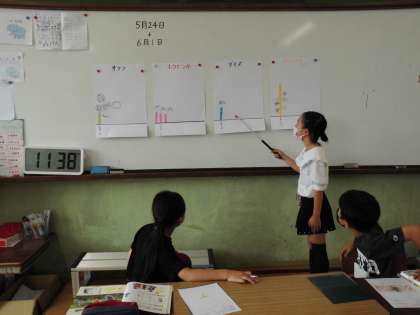 理科では、ヒマワリ・ホウセンカ・オクラ・ダイズの種を植えて今育てています。芽が出てきたので、みんなでそれぞれの大きさを紙テープを使って測りました。今後それぞれの植物がどのように成長していくか、比べながら観察を続けていきます。