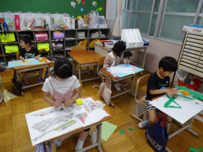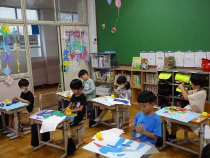 図画工作科で「やぶいたかたちから うまれたよ」の学習をしました。画用紙や包装紙、新聞などをやぶってみると、いろんな形にみえてきます。なんか「火みたいやな」「おさかなが口を開けているみたい」などみんなで話して楽しんでいました。そしてやぶいてできた形をならべたり、組み合わせたりして画用紙にはっていきました。友だちの作っているものを見て、「すごい!」「いいなあ!」と楽しく話しながら学習していた姿がすてきでした。完成するのが楽しみです。