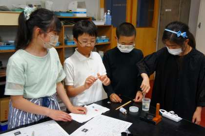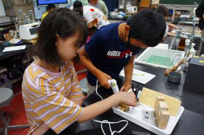 様々な実験をさせていただきましたが、その中でキーホルダー作りもさせていただきました。図工の学習でも使うグルーガンを使って、型にグルーを流し込んでいきます。