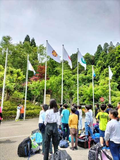 花背山の家に到着しました。スタッフの方々に元気よく挨拶して入所式が始まりました。みんなで作った旗がなびいています。