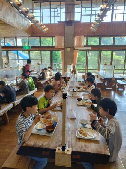お風呂のあとは午後5時半から夕食です。肉じゃがフライにシュウマイ、ちくわとれんこんのサラダなどまたお昼とは違う献立を楽しみながらいただきました。みんなよく食べて元気に過ごしています。