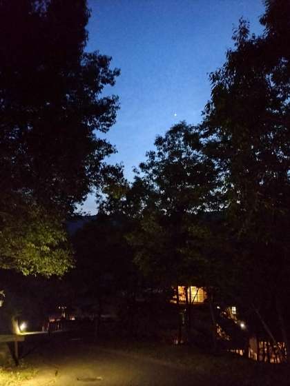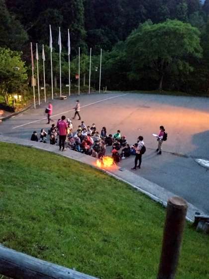 今日の最後の野外活動はナイトハイクです。グループごとにランタンの灯りをたよりに夜道を歩きます。自然の中の澄んだ空気、川や木々いろいろな音を感じながら歩いています。
