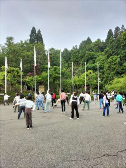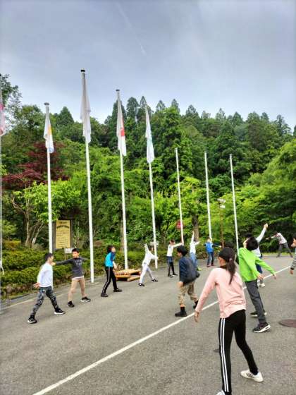おはようございます。朝の集いをしました。体操で身体も目覚めさせ、今日のめあてや活動の確認などしました。みんな元気です。天候は今のところ曇りです。